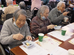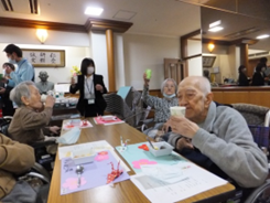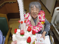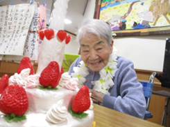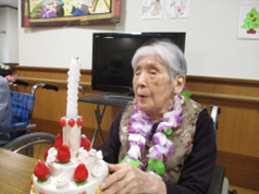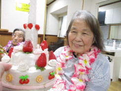 お誕生者代表の利用者様にケーキのろうそくを吹き