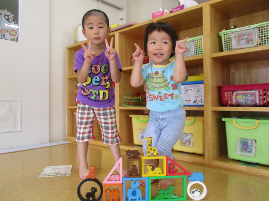 どうどう?うまくできたでしょ? Posted on 2020年8月16日 | by 梅林園 梅林園には「子育て支援ルーム」があります。職員が安心して働ける環境づくりとして託児所を設けています。 今日は、ふたりで動物のお家作り。 たくさんの動物が集まるおうちができたよ! 子育て支援ルーム