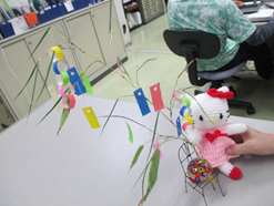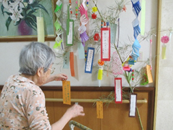 7月7日に七夕会を開催しました。ご家族様に送って頂いた願い事の書かれた短冊は、事前に利用者さんと笹に飾らせて貰い、7日にいくつかを放送で読み上げさせて頂きました。