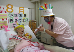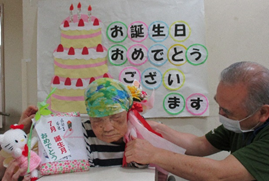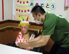 丁度居合わせた職員の藤井主任も誕生月だったので歌ってお祝いをしましたが、彼は介護のプロなので照れながらも一生懸命利用者さんの爪を切っていました(^^)/